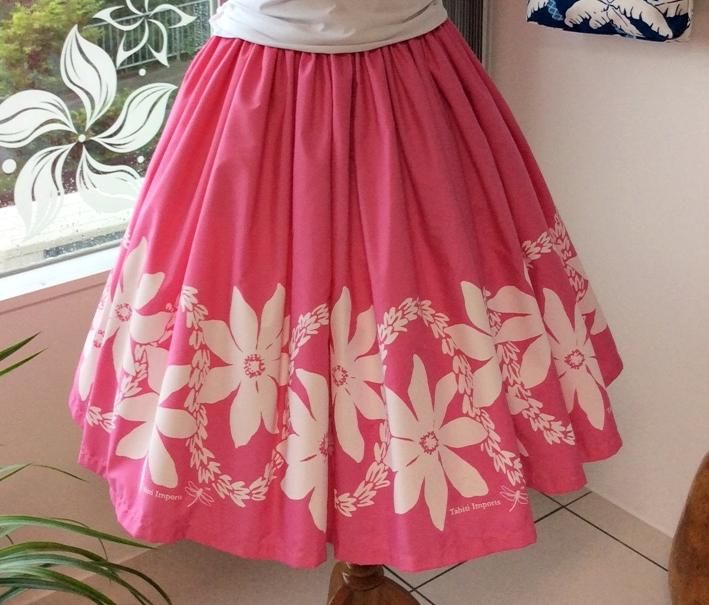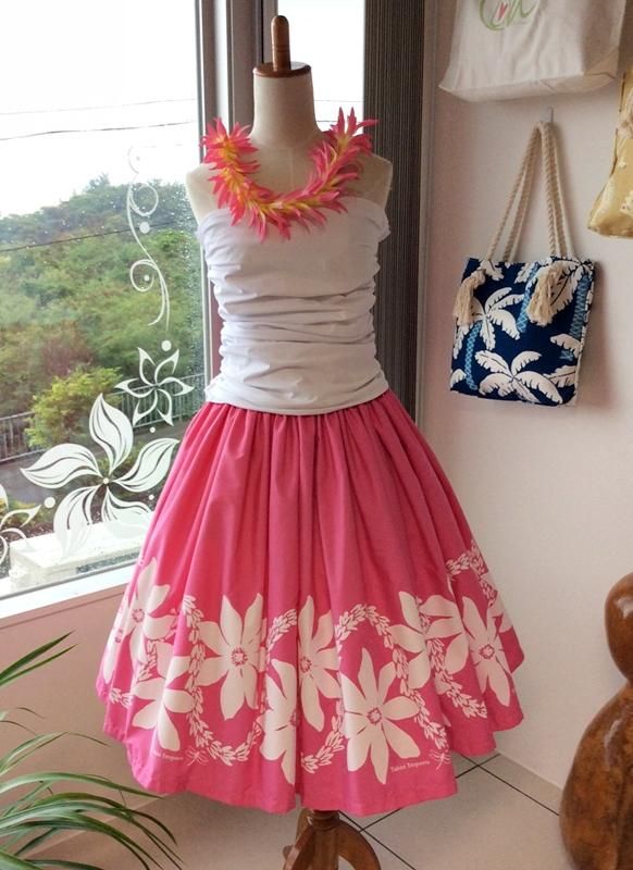 TOP > 【既成】 タヒチインポーツ シングルパウ Pink& White ティアレ柄 ウエストゴム4本 丈75cm 【送料無料】
